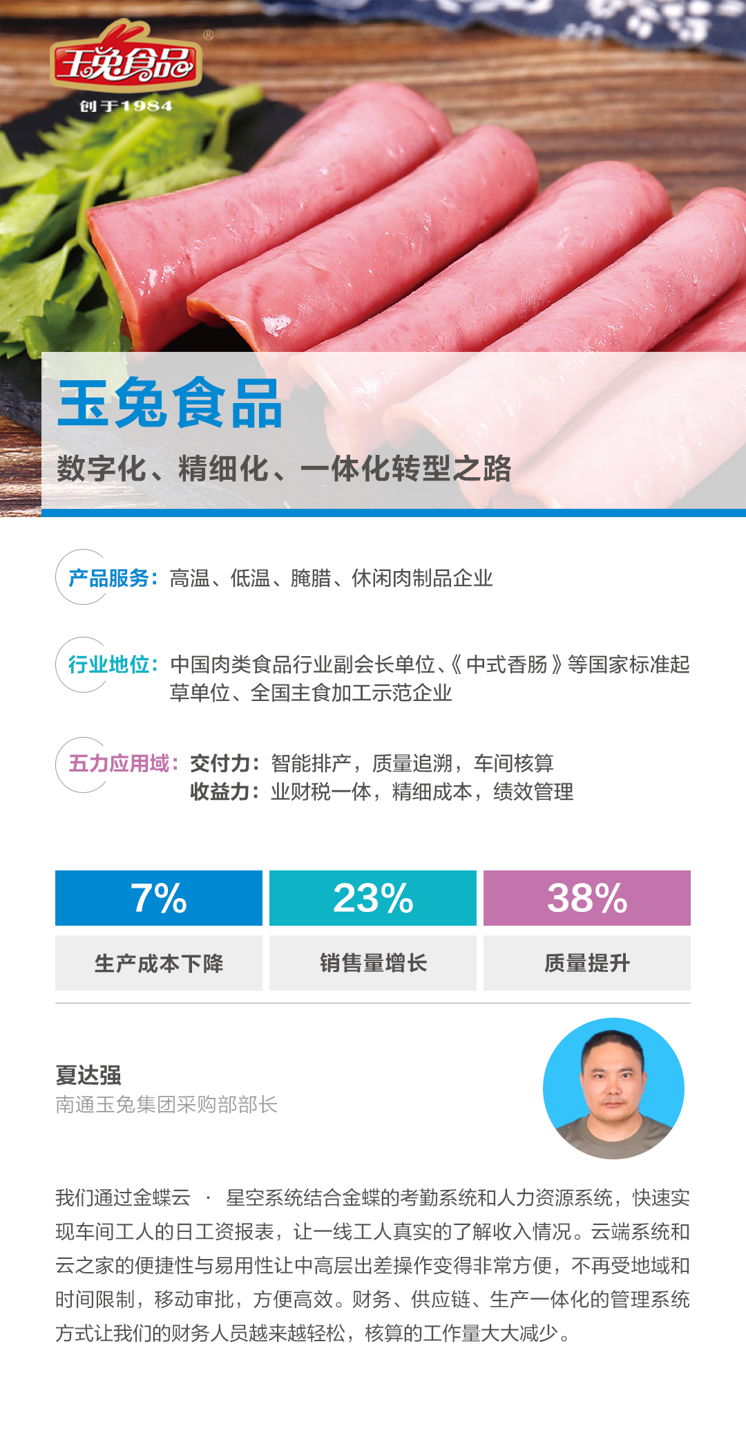 南通玉兔集團(tuán)有限公司(下文簡稱“玉兔集團(tuán)”)是一家集肉制品研發(fā)、生產(chǎn)、銷售于一體的綜合性集團(tuán)公司,公司成立于1984年,是生產(chǎn)肉制品的老牌企業(yè)。憑借超前的市場意識(shí)和優(yōu)良的品質(zhì)管理,成為行業(yè)翹楚及國內(nèi)知名企業(yè)。公司引進(jìn)世界先進(jìn)加工設(shè)備,融合國際前沿工藝技術(shù),形成了從生豬收購、屠宰、分割到產(chǎn)品加工一條龍的現(xiàn)代化生產(chǎn)線。玉兔肉制品具有“品種多樣化、規(guī)格系列化”的產(chǎn)業(yè)結(jié)構(gòu)特點(diǎn)和領(lǐng)先同行的產(chǎn)品結(jié)構(gòu)布局,主要生產(chǎn)高溫、低溫、腌臘、休閑四大類兩百多個(gè)不同規(guī)格品種的肉制品。