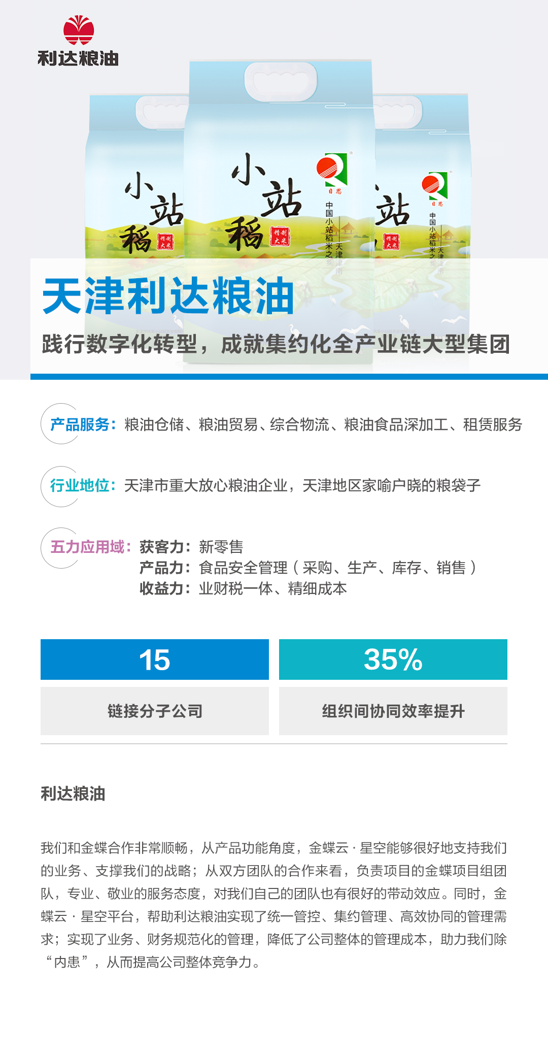 作為天津區(qū)域重大放心糧油企業(yè),利達(dá)糧油始終踐行“以人民為中心”的發(fā)展理念,嚴(yán)把從農(nóng)田到餐桌的每一道防線,用創(chuàng)新引領(lǐng)健康糧油食品產(chǎn)業(yè),努力服務(wù)天津市民的“放心菜籃子”。在這樣的使命和愿景下,明確通過(guò)糧食存儲(chǔ)、糧油貿(mào)易、綜合物流、糧食深加工、租賃服務(wù),這五大戰(zhàn)略做支撐。