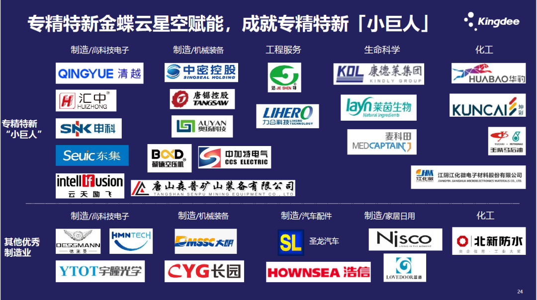 金蝶結(jié)合多年實(shí)踐,總結(jié)出這樣一種新的思維和新的解決方案的架構(gòu)框架。通過金蝶云·星空的這樣的產(chǎn)品體系,我們成就了很多專精特新“小巨人”企業(yè),不管是在制造業(yè)還是其他服務(wù)型企業(yè),我們都扮演著極其重要的數(shù)字化服務(wù)提供商的角色。