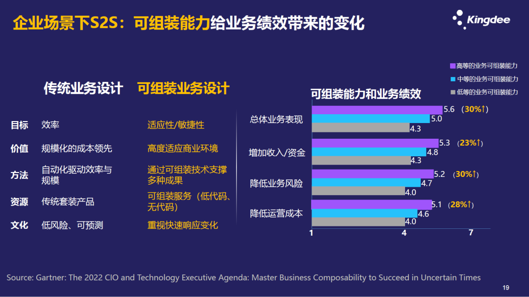 在企業(yè)的場景當(dāng)中,這種服務(wù)到服務(wù)的可組裝能力,會(huì)給企業(yè)帶來不一樣的改變嗎?在Gartner2022年對(duì)于CIO的一個(gè)調(diào)研中,我們發(fā)現(xiàn),傳統(tǒng)的業(yè)務(wù)設(shè)計(jì)在效率規(guī)?;㈧`活性方面還有很大的缺陷,而通過這種服務(wù)的可組裝設(shè)計(jì)以后,可以增加收入,降低運(yùn)營和業(yè)務(wù)的風(fēng)險(xiǎn),并且快速地響應(yīng)外面的變化。