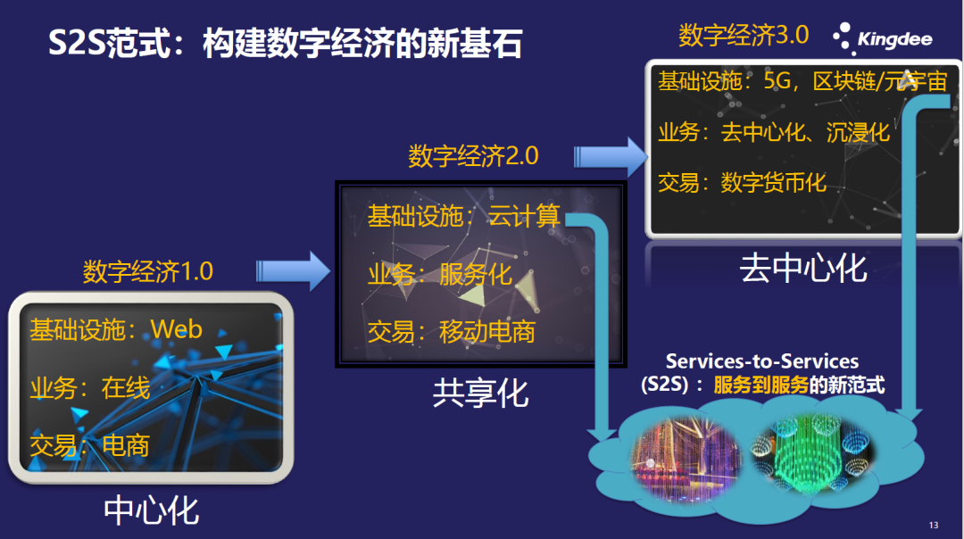我把整個(gè)數(shù)字經(jīng)濟(jì)發(fā)展的趨勢歸類總結(jié)為三個(gè)階段:第一是以web網(wǎng)頁服務(wù)器作為基礎(chǔ)設(shè)施的數(shù)字經(jīng)濟(jì)1.0,它所有的業(yè)務(wù)方式都是在線,比如電子郵件在線化、辦公在線化,它的交易方式產(chǎn)生了電子商務(wù),比如eBay、亞馬遜這些知名企業(yè)。數(shù)字經(jīng)濟(jì)1.0時(shí)代的最基本的特征就是中心化,所有的一切都是基于網(wǎng)頁服務(wù)器為中心展開的。我們現(xiàn)在是以云計(jì)算作為基礎(chǔ)設(shè)施的數(shù)字經(jīng)濟(jì)2.0時(shí)代,它的業(yè)務(wù)講究的是碎片化、服務(wù)化,把各種各樣的大的軟件碎片化,變成10個(gè)、20個(gè)、100個(gè)獨(dú)立的功能,然后把這些功能以服務(wù)的方式展現(xiàn)價(jià)值,我們的交易方式70%到80%都來自移動(dòng)電商、移動(dòng)互聯(lián)網(wǎng),所以說現(xiàn)在的數(shù)字經(jīng)濟(jì)2.0典型的特征是資源共享的共享化模式。