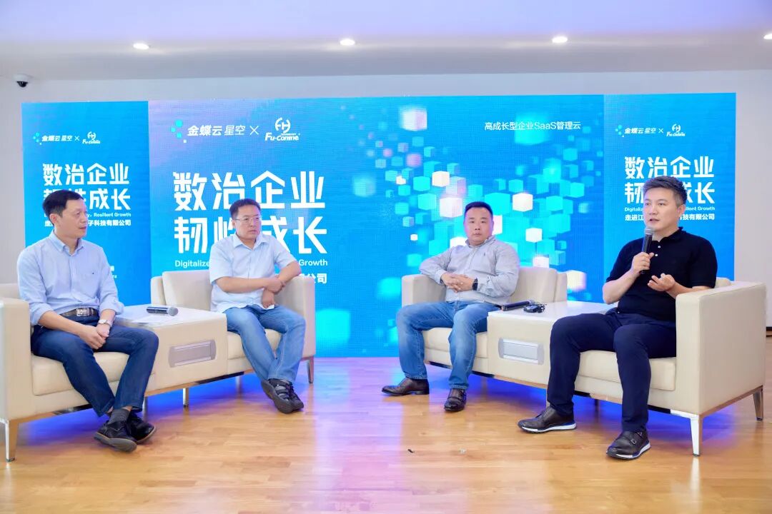 在高管對話環(huán)節(jié),金蝶云·星空PLM總監(jiān)姚文兵作為主持人,就金蝶云·星空與富浩的合作內(nèi)容,與富浩集團董事長、CEO許春鋒,金蝶中國總裁章勇,南通大學(xué)經(jīng)濟與管理學(xué)院副教授鄧恒進展開了深度交流。