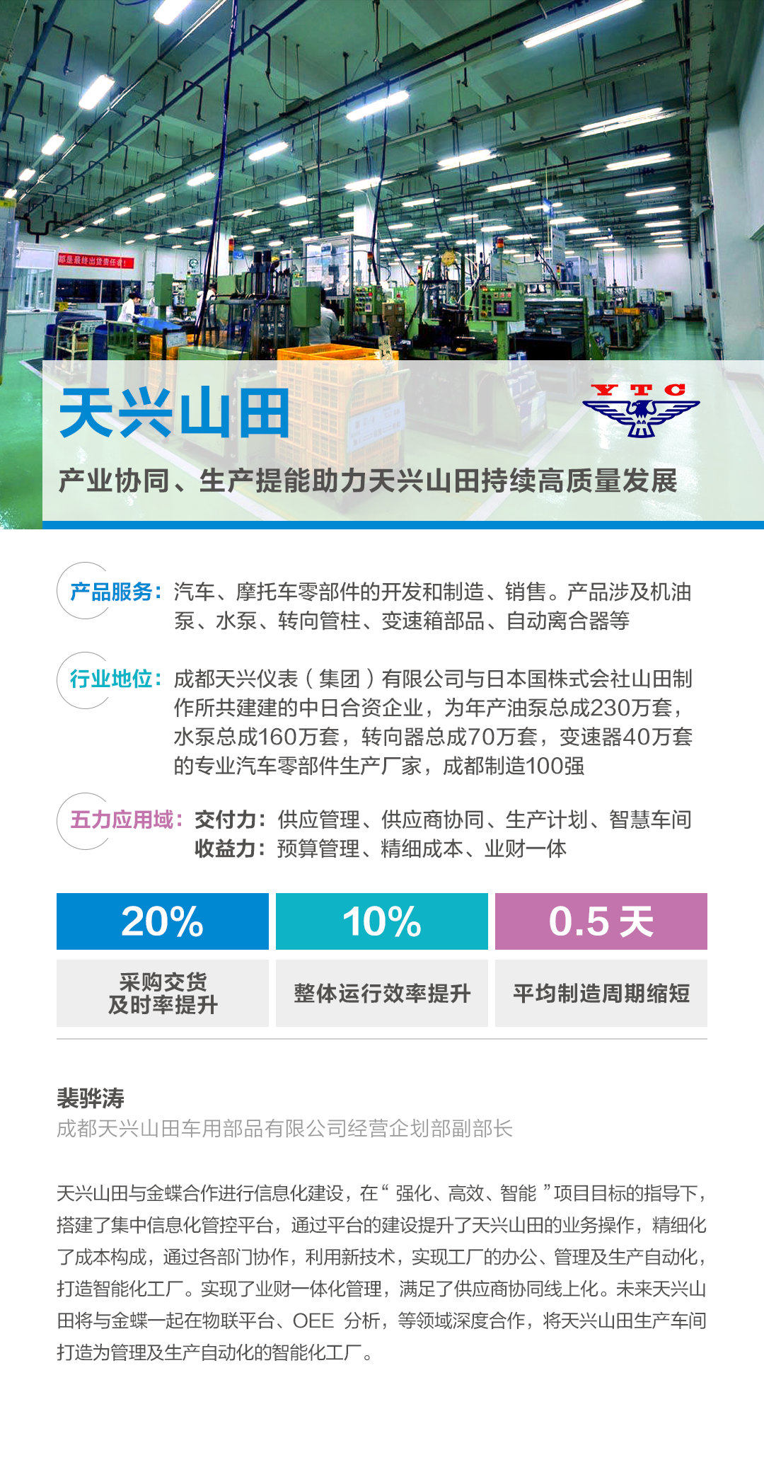 信息化平臺(tái)的升級(jí)建設(shè)使得系統(tǒng)響應(yīng)更加高效,同時(shí)新平臺(tái)全面整合了天興山田內(nèi)外部資源和流程,業(yè)務(wù)協(xié)同更加緊密,流程執(zhí)行更加高效(客戶協(xié)同、供應(yīng)商協(xié)同、計(jì)劃和執(zhí)行協(xié)同、業(yè)務(wù)和財(cái)務(wù)協(xié)同、薪酬核算效率提升)。采購(gòu)交貨及時(shí)率提升20%,整體運(yùn)行效率提升10%。